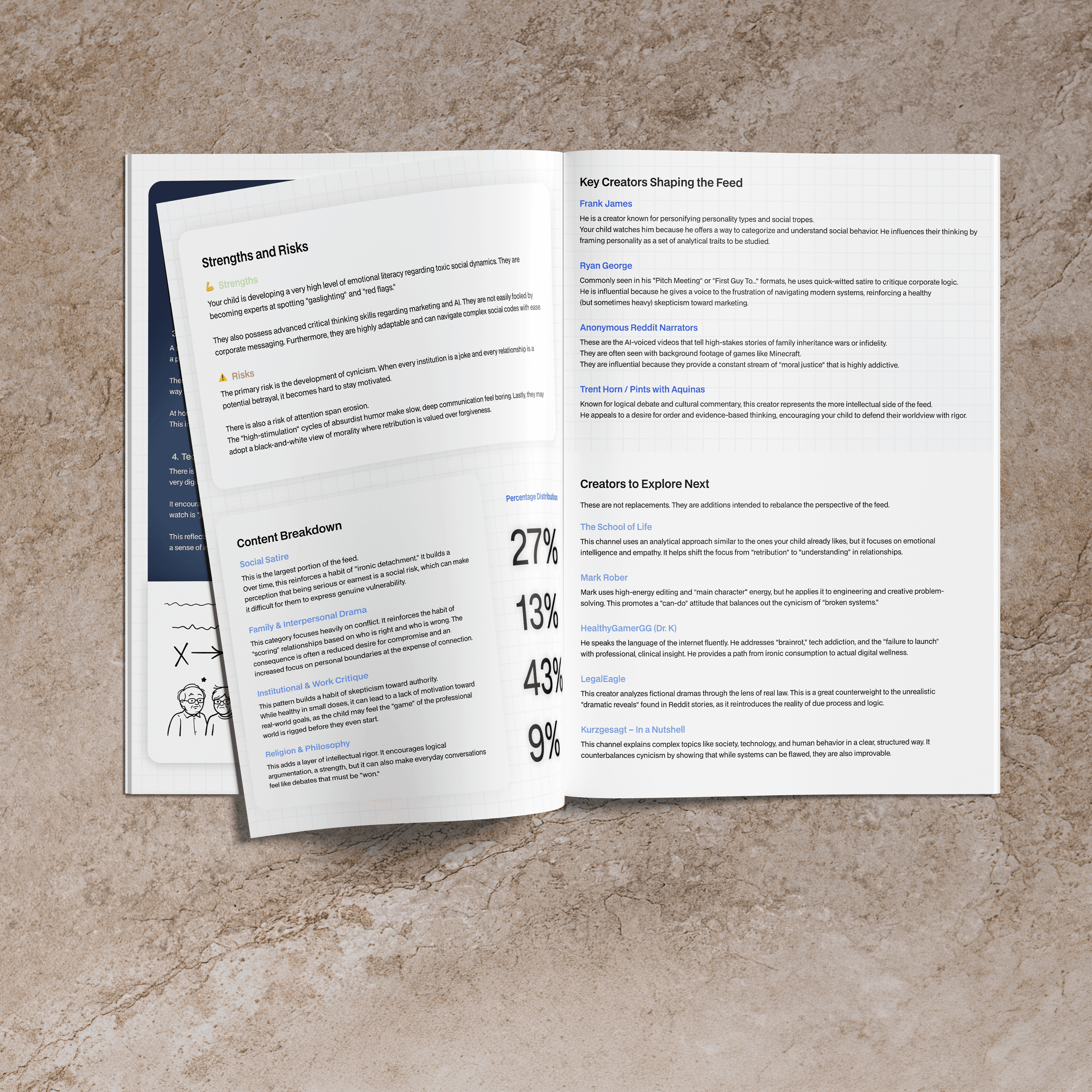 You get a clear view of what your child is actually exposed to and the patterns that shape their thinking over time. The report shows which ideas and beliefs are being reinforced, how the feed may influence behavior and decisions, and why certain content keeps appearing. It also gives you simple guidance so you can respond in a thoughtful way without needing to control or monitor.